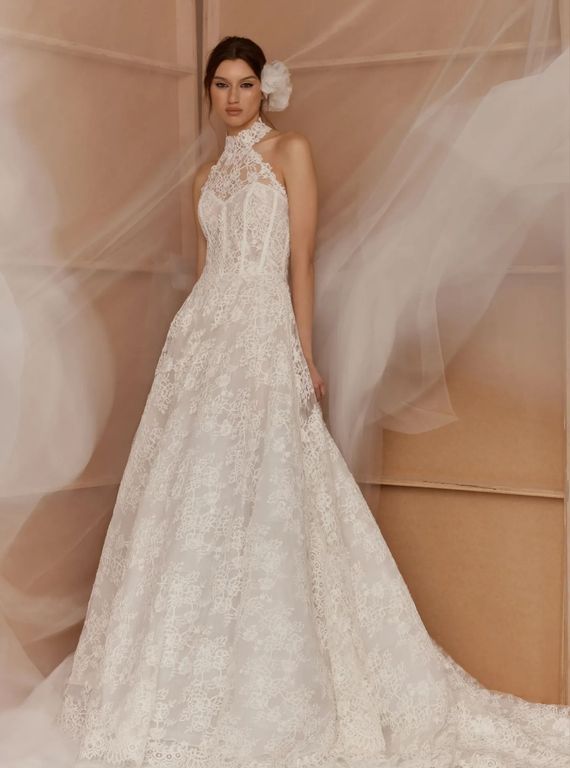 - Silüeti yukarı çeken ve vücudu formda gösteren bu halter yaka gelinlik, biçimli omuz ve kollarla muhteşem bir görüntü veriyor.