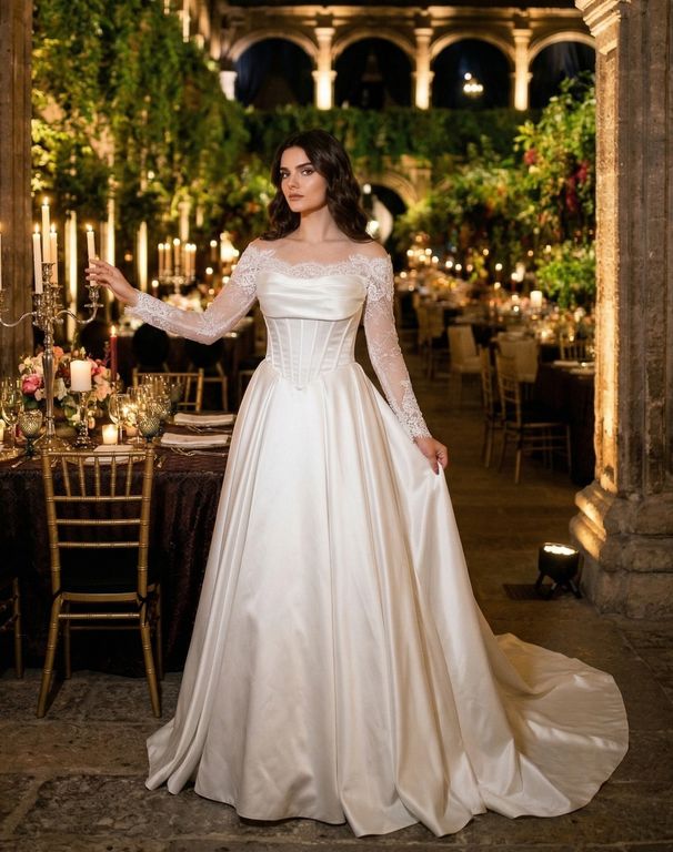 - Bir omuzdan diğerine doğru kayık formunda bir eğim çizen bu kayık yakalı gelinlik, yarattığı efekt sayesinde dar omuzları geniş gösteriyor.