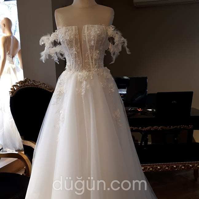 Üst beden transparan,eteğe doğru inen dantel işlemeli, tüy ile detaylandırılmış, romantik, kır düğünü için uygun gelinlik