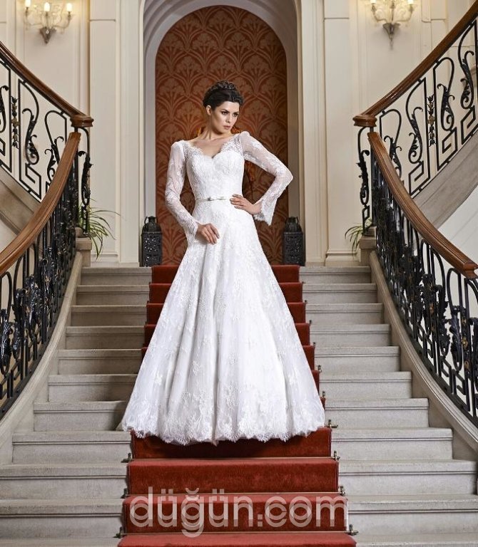 Dantel uzun kolları ve gerdan açıklığıyla birlikte asıl vurguyu derin bir U dekoltesi ile sırta yapan, belindeki ince ve zarif kemerle kendi hoş duruşunu destekleyen A kesim gelinlik.