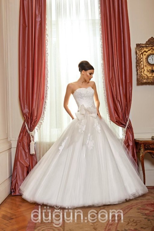 Üst beden dantel işlemeli, bel kısmında yer alan büyük fiyonk ile süslendirilmiş, tül etek gelinlik