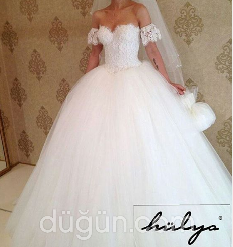 Üst kısmı dantel işlemeleri ile süslenmiş,düşük omuzlu, tül etekli, prenses kesim gelinlik