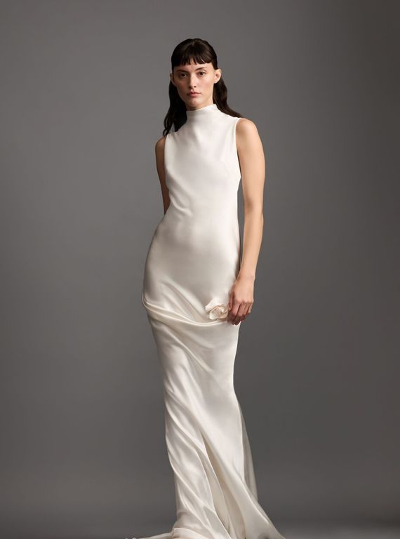 - İnce ve uzun bir boyna sahip gelinlere çok yakışan bu hakim yaka gelinlik, özellikle topuz gelin saçı ile kombinlenince çok şık bir görüntü yaratıyor.