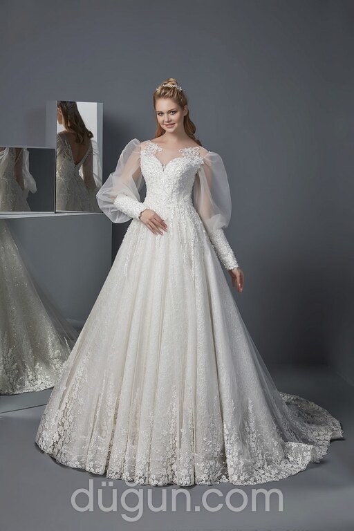 Dantelli, balon kol detaylı gelinlik.