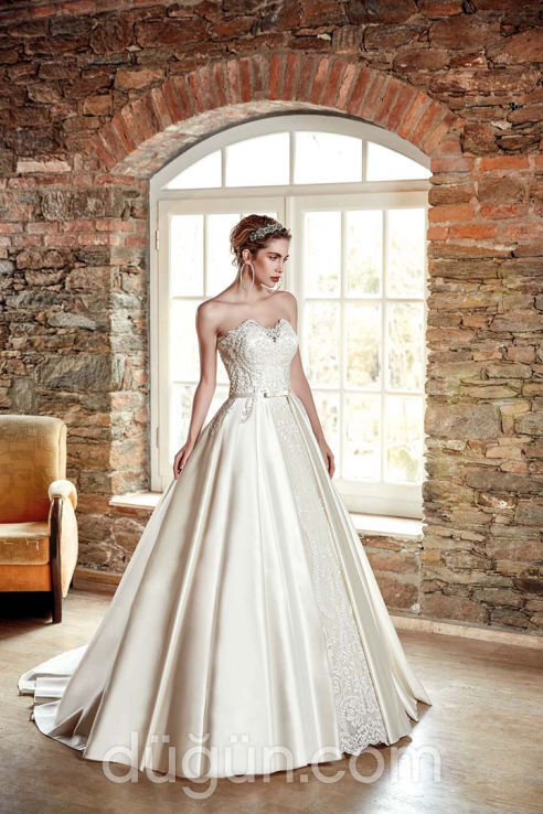 - Omuzları öne çıkaran bu straplez yaka gelinlik, özellikle açık ya da yarım toplu saç modelleri ile büyük bir uyum sağlıyor.