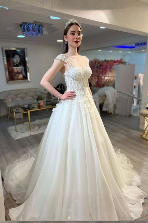 İşlemeli Güpür Detaylı V Yaka A Kesim Gelinlik