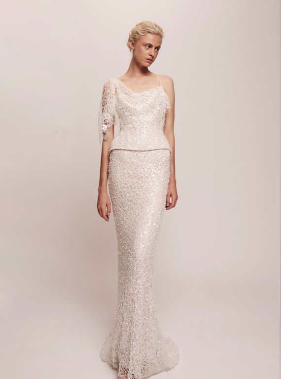 - Dikkati üst bedende yoğunlaştıran tek omuzlu bu gelinlik, özellikle dağınık topuz gelin saçı ile mükemmel bir uyum yakalıyor.