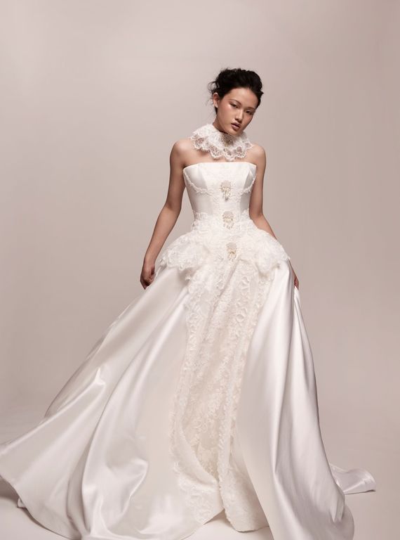 - Omuzları öne çıkaran bu straplez yaka gelinlik, özellikle açık ya da yarım toplu saç modelleri ile büyük bir uyum sağlıyor.
