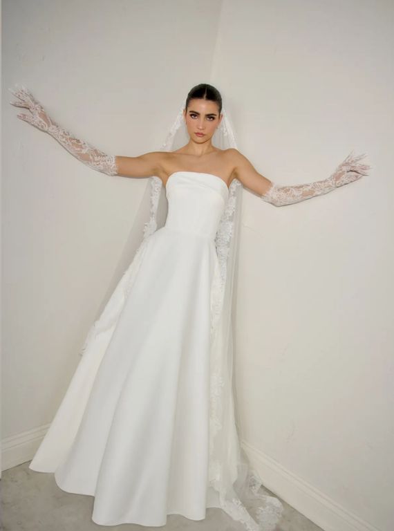 - Omuzları öne çıkaran bu straplez yaka gelinlik, özellikle açık ya da yarım toplu saç modelleri ile büyük bir uyum sağlıyor.
