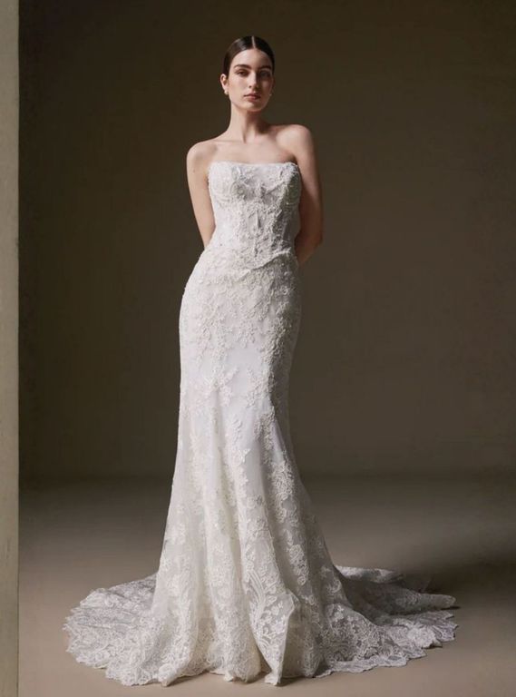- Omuzları öne çıkaran bu straplez yaka gelinlik, özellikle açık ya da yarım toplu saç modelleri ile büyük bir uyum sağlıyor.
