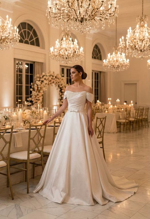 Drape detaylı, kemerli, düşük omuz, saten, işleme detaylı, A kesim gelinlik