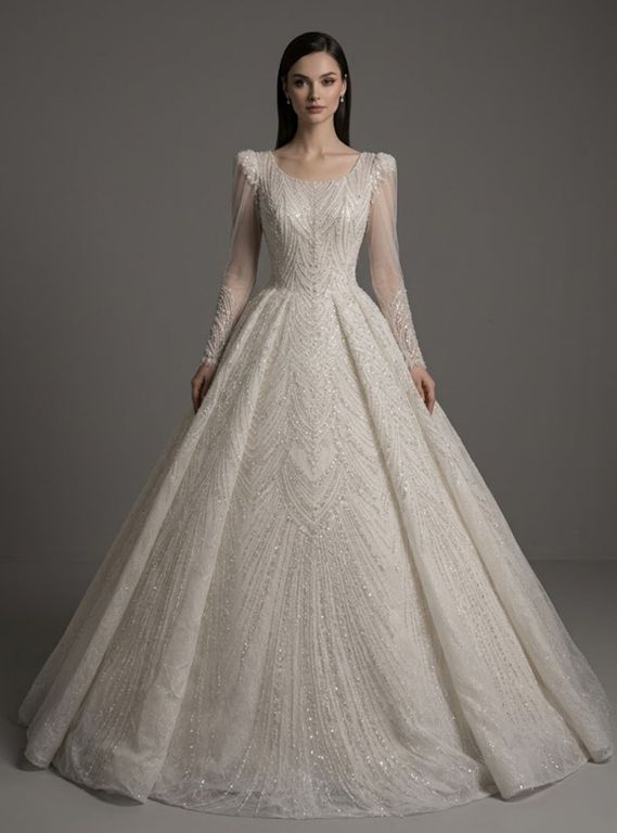 Prenses Gelinlik, yoğun ışıltılı işlemeleri ve gösterişli siluetiyle dikkat çeken özel bir tasarımdır. Yuvarlak yaka formu, transparan uzun kolları ve taş işlemeli yüzeyi modele zarif bir ihtişam kazandırır. Belden itibaren hacimli şekilde açılan prenses kesim etek, masalsı bir görünüm sunarken arka bağcık detayı vücuda uyum sağlar. Gösterişli ve asil bir gelinlik isteyen gelin adayları için ideal bir seçimdir.