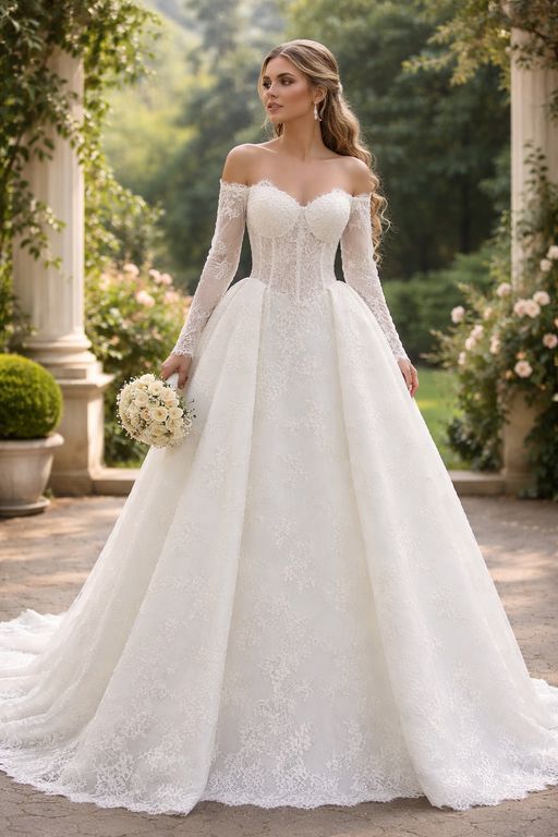 Madonna yaka, Fransız Lez dantelli, prenses form gelinlik ihtişamlı düğünler için harika bir seçenek.