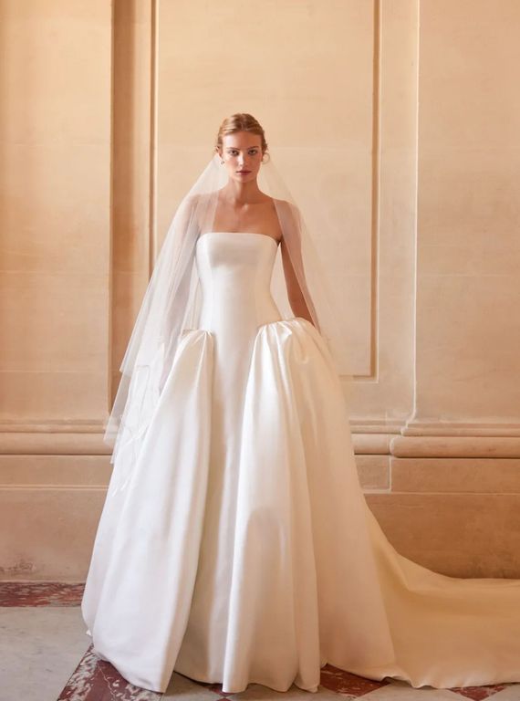 - Omuzları öne çıkaran bu straplez yaka gelinlik, özellikle açık ya da yarım toplu saç modelleri ile büyük bir uyum sağlıyor.