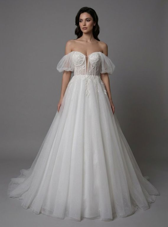 Düşük balon kollu, korseli, tül ve simli etekli, A kesim gelinlik