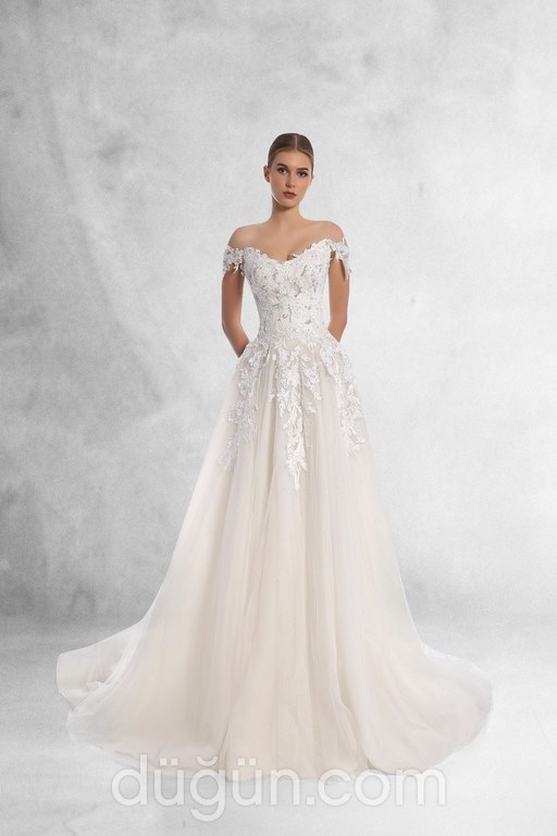 Helenistik omuz detaylı dantel geçişli kuyruklu tül etekli gelinlik modelidir.