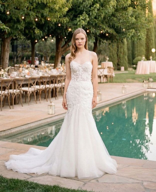 - Basen bölgesini sıkıca saran balık gelinlikler, kum saati vücut tipine sahip gelinler için ideal.