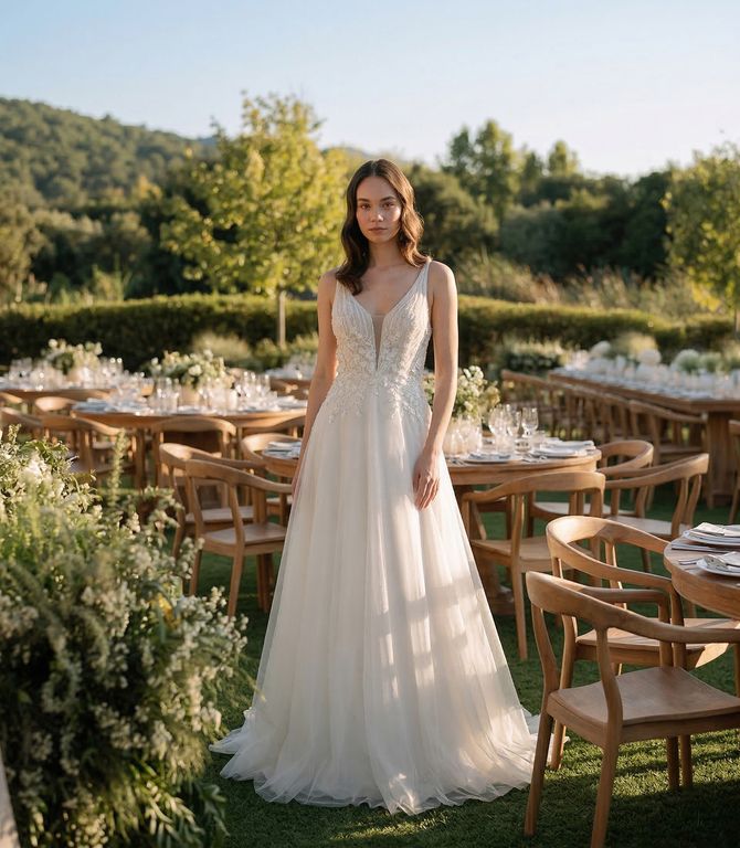 - Naif ve sakin tarzını gelinliğine yansıtmak istiyorsan ve masal gibi bir kır düğünü ile evleneceksen, bu romantik model uygun seçim olabilir.