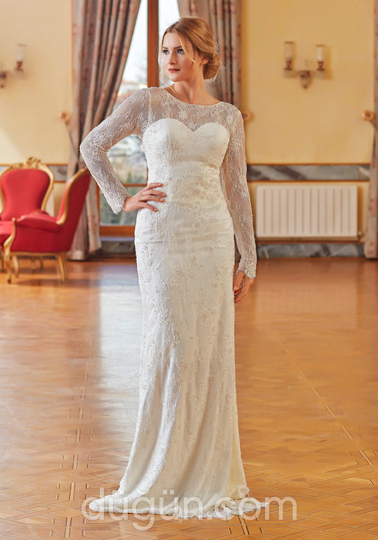 Komple dantelli, yer yer beyaz işlemeli, kuyruklu balık kesim gelinlik.