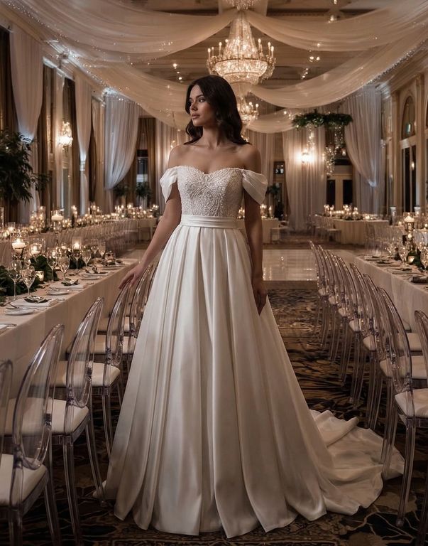 - En çok tercih edilen yaka tiplerinden bu düşük omuz gelinlik, özellikle dar omuzlu gelinlere çok yakışıyor.
