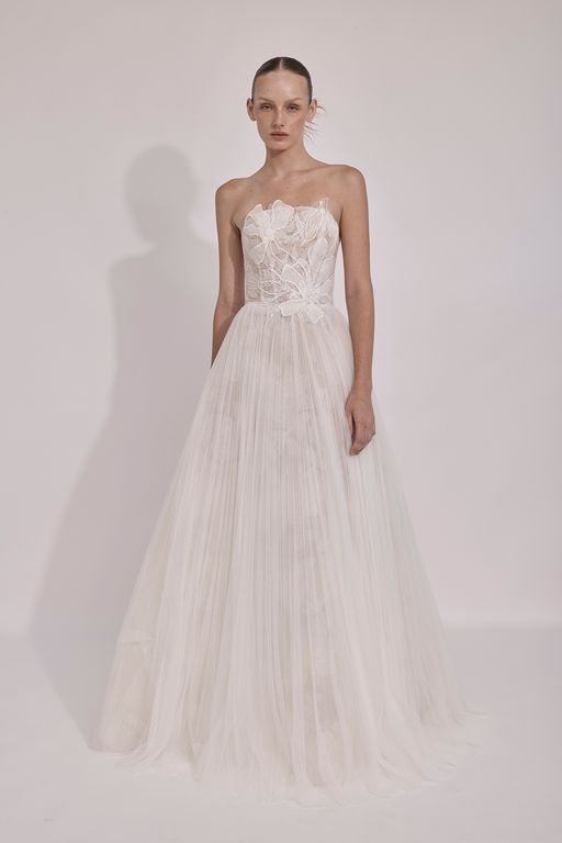- Omuzları öne çıkaran bu straplez yaka gelinlik, özellikle açık ya da yarım toplu saç modelleri ile büyük bir uyum sağlıyor.