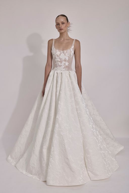 - U harfi formundaki bu U yaka gelinlik, köprücük kemiğini sergileyerek, vücuda zarif bir görüntü katıyor.