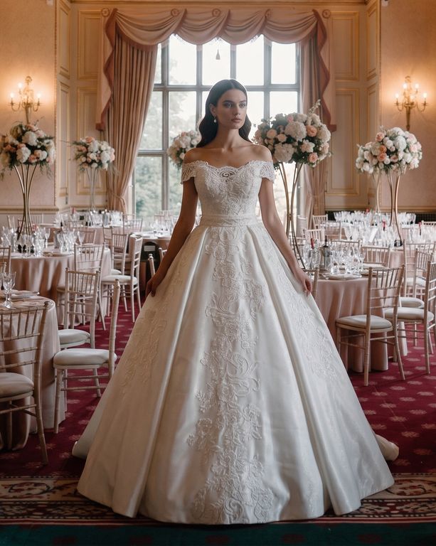 Dantel detaylı, düşük omuz, kemerli, A kesim gelinlik