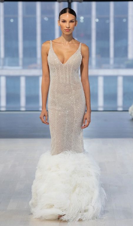 - Basen bölgesini sıkıca saran balık gelinlikler, kum saati vücut tipine sahip gelinler için ideal.
