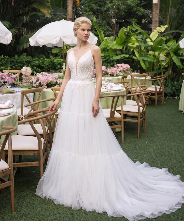 V yaka, askılı, tül etekli, dantel işlemeli, A kesim gelinlik