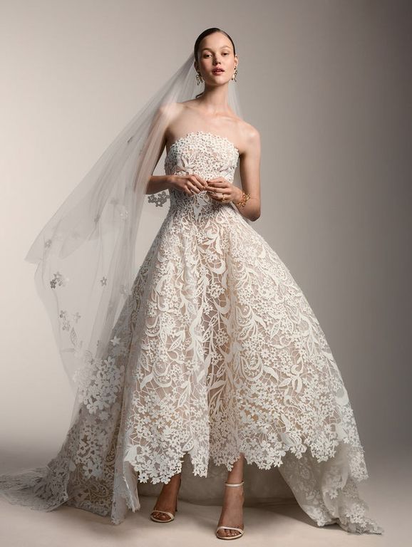 - Omuzları öne çıkaran bu straplez yaka gelinlik, özellikle açık ya da yarım toplu saç modelleri ile büyük bir uyum sağlıyor.