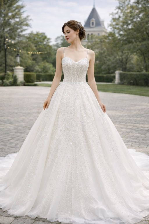Işıltılı Prenses Askılı Gelinlik, zarif askılı tasarımı ve baştan aşağı işleme detaylarıyla dikkat çeken gösterişli bir modeldir. Kalp yaka formundaki üst bedeni vücuda zarif bir uyum sağlarken yoğun boncuk ve taş işlemeleri gelinliğe ihtişam kazandırır. Belden itibaren genişleyen prenses kesim etek masalsı bir siluet oluşturur. Arkadaki bağcıklı sırt detayı hem estetik görünüm sağlar hem de vücuda uyum sunar. Işıltılı ve romantik bir gelinlik isteyen gelin adayları için ideal bir tercihtir.