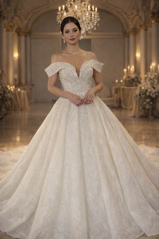 Üç boyutlu yoğun inci nakışlı, Madonna yakalı, prenses model gelinlik