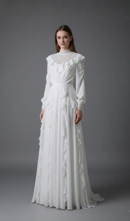 - İnce ve uzun bir boyna sahip gelinlere çok yakışan bu hakim yaka gelinlik, özellikle topuz gelin saçı ile kombinlenince çok şık bir görüntü yaratıyor.