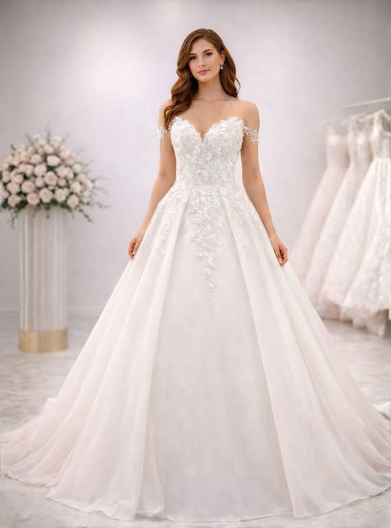 Kalp yaka 3D çiçek aplikeli prenses gelinlik modeli, romantik ve gösterişli bir görünüm isteyen gelin adayları için tasarlandı. Üst bedeninde yer alan yoğun üç boyutlu çiçek aplikeler ve zarif dantel işlemeler, bele doğru incelen bir siluet oluşturur. Vücudu toparlayan korsaj yapısı sayesinde bel daha ince görünür. Gösterişli ama zarif bir prenses gelinlik arayanlar için ideal bir tasarımdır.