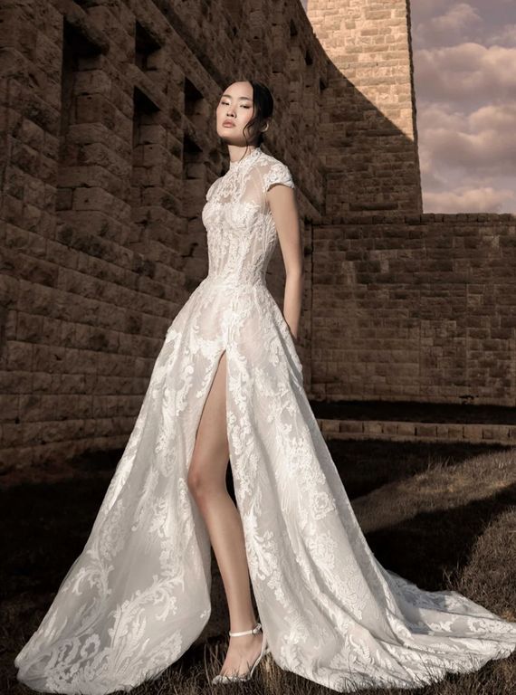 - İnce ve uzun bir boyna sahip gelinlere çok yakışan bu hakim yaka gelinlik, özellikle topuz gelin saçı ile kombinlenince çok şık bir görüntü yaratıyor.