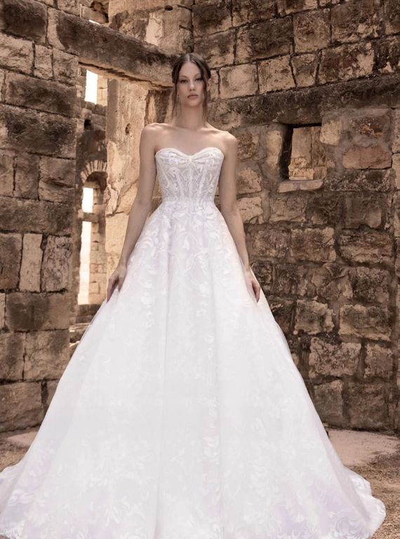 - Omuzları öne çıkaran bu straplez yaka gelinlik, özellikle açık ya da yarım toplu saç modelleri ile büyük bir uyum sağlıyor.