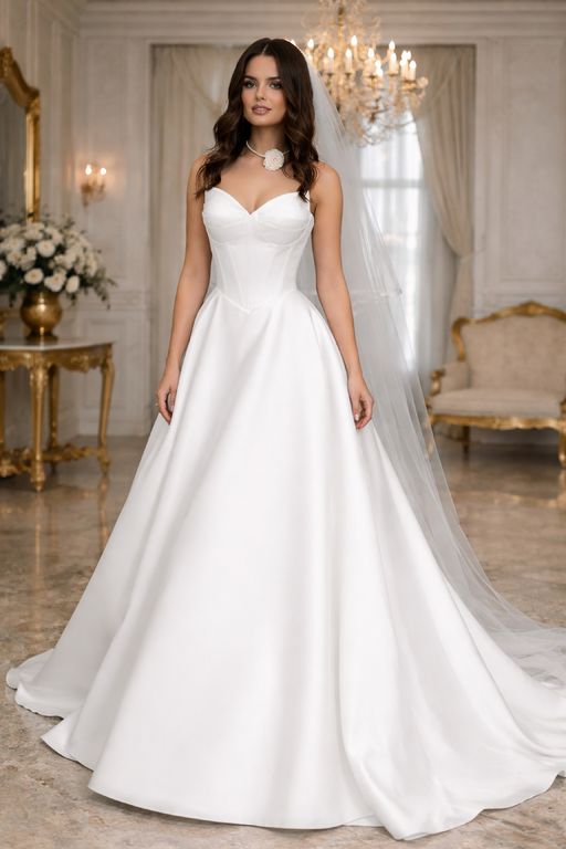 A kesim, göğüs üzeri drapeli saten gelinlik.
