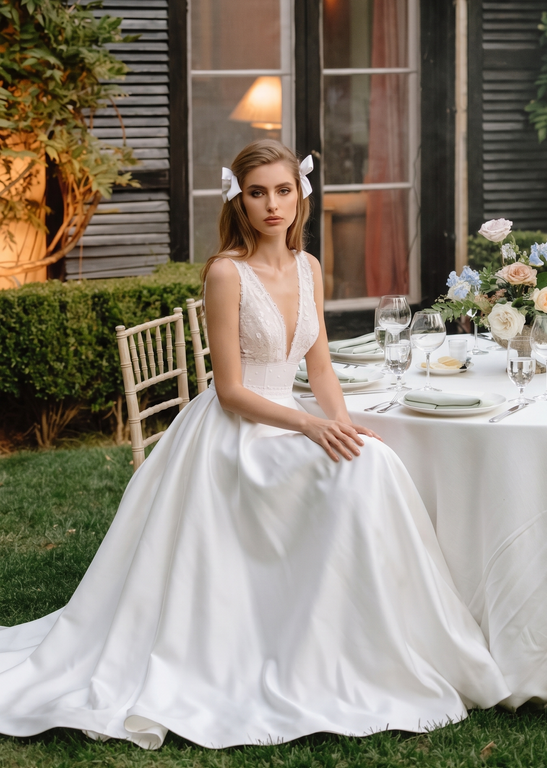 - Pürüzsüz ve sert yapıya sahip mikado kumaştan hazırlanan bu gelinlik, sonbahar ve kış aylarında evlenecek gelinlerin favorisi olacak.