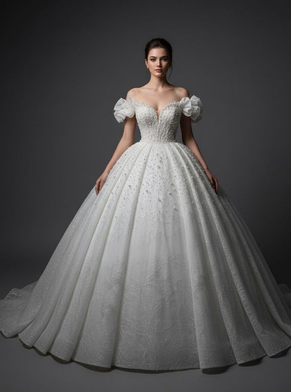 Büyüklü küçüklü inci detaylarının yer aldığı, kolları fırfırlı gelinlik