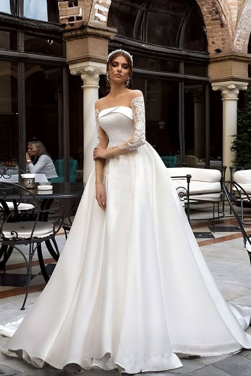 Dantel kol detaylı, işlemeli, saten etekli, A kesim gelinlik