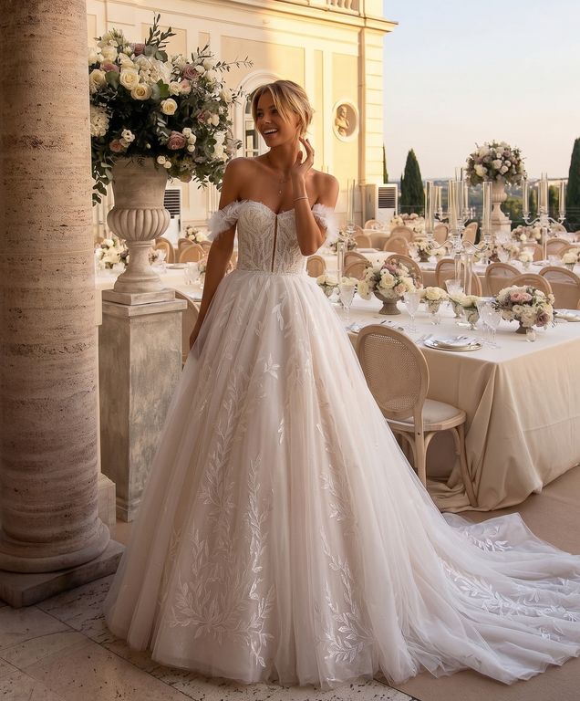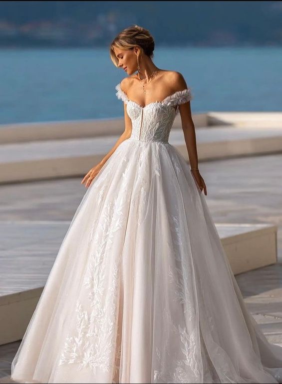 Korseli, düşük omuz, tül etekli, A kesim gelinlik