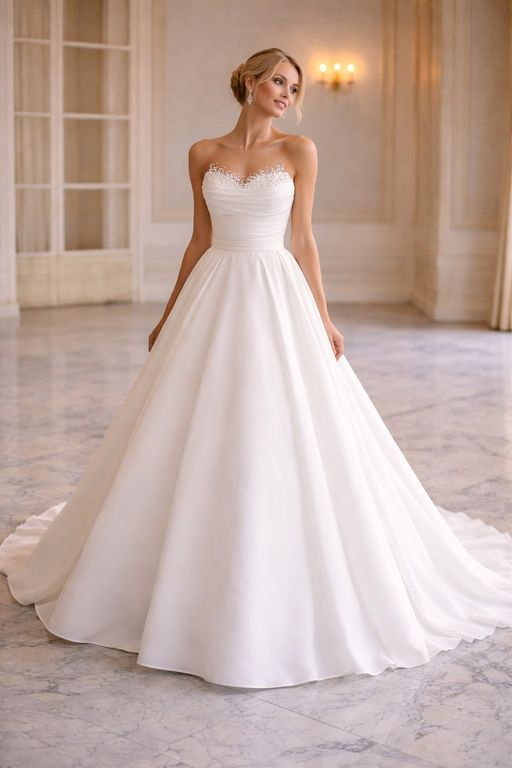 Zarif ve sade şıklığı bir araya getiren bu gelinlik modeli, straplez tasarımı ve sırt dekolteli kesimiyle modern bir görünüm sunuyor. Vücuda oturan üst bedeni beli zarifçe vurgularken, belden itibaren genişleyen A kesim eteği akıcı ve romantik bir siluet oluşturuyor. Sırt kısmında yer alan düğme detayları modele sofistike bir dokunuş katarken, uzun ve dökümlü kuyruğu ihtişamlı bir duruş sağlıyor.