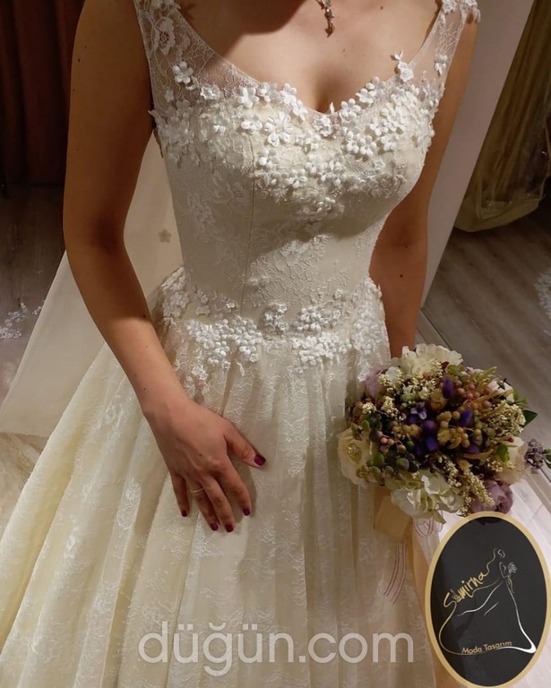 Komple dantelli, minik üç boyutlu çiçeklerin yer aldığı gelinlik.