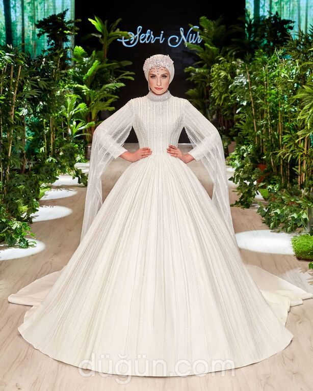 Komple işlemeli, omuz kısımlarından pelerin görünümü sağlanmış tesettür gelinlik.