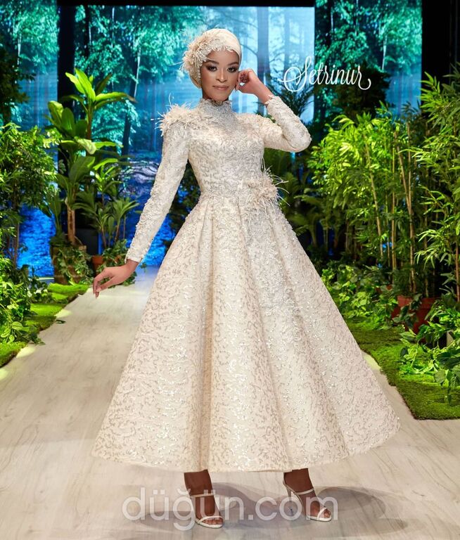 Omuz ve bel kısmında üç boyutlu, tüylü çiçek detayının bulunduğu, vintage esintilere sahip tesettür gelinlik.