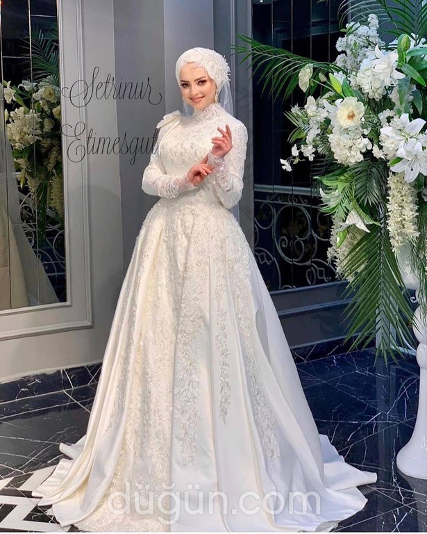 Beyaz işlemeli, tek omzunda üç boyutlu detayı bulunan tesettür gelinlik.