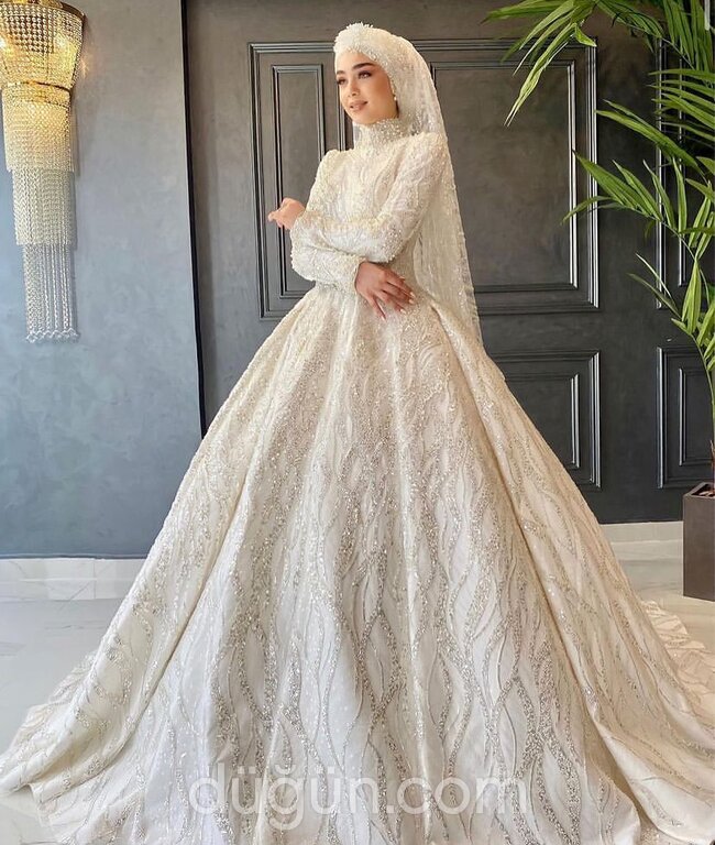 - İnce ve uzun bir boyna sahip gelinlere çok yakışan bu hakim yaka gelinlik, özellikle topuz gelin saçı ile kombinlenince çok şık bir görüntü yaratıyor.