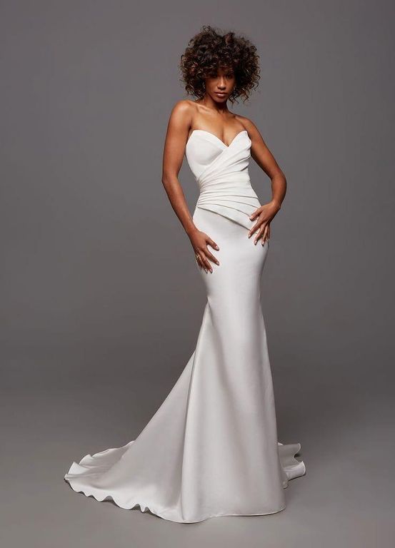 - Basen bölgesini sıkıca saran balık gelinlikler, kum saati vücut tipine sahip gelinler için ideal.