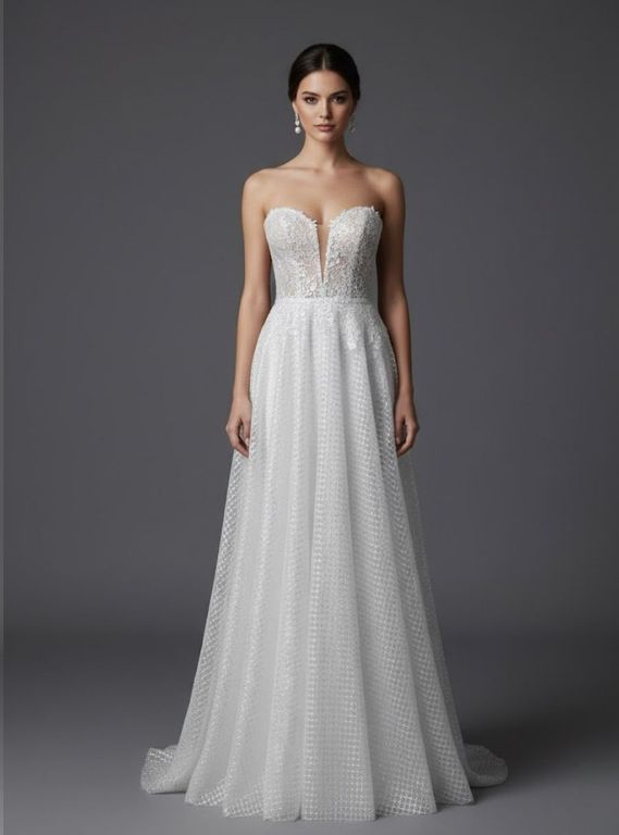 - Omuzları öne çıkaran bu straplez yaka gelinlik, özellikle açık ya da yarım toplu saç modelleri ile büyük bir uyum sağlıyor.