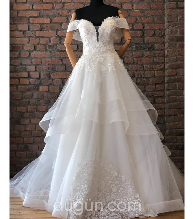 Üst beden ve etek ucunda çiçeksi desen ve dantellerin yer aldığı, kat etek detaylı gelinlik.